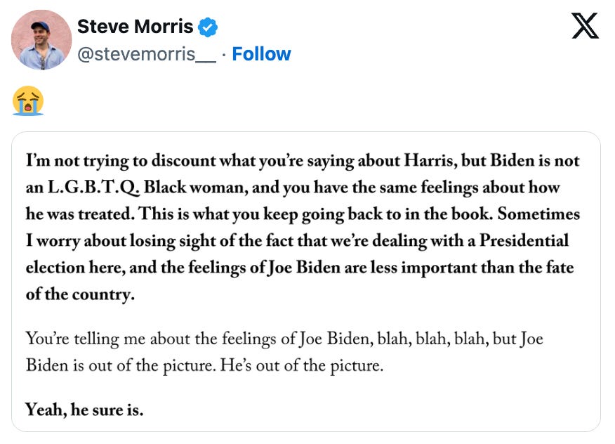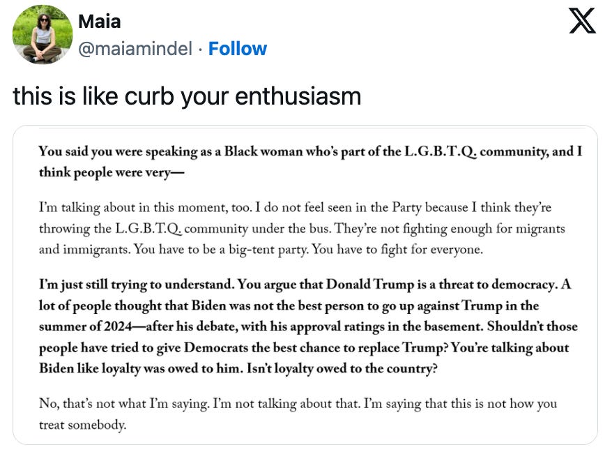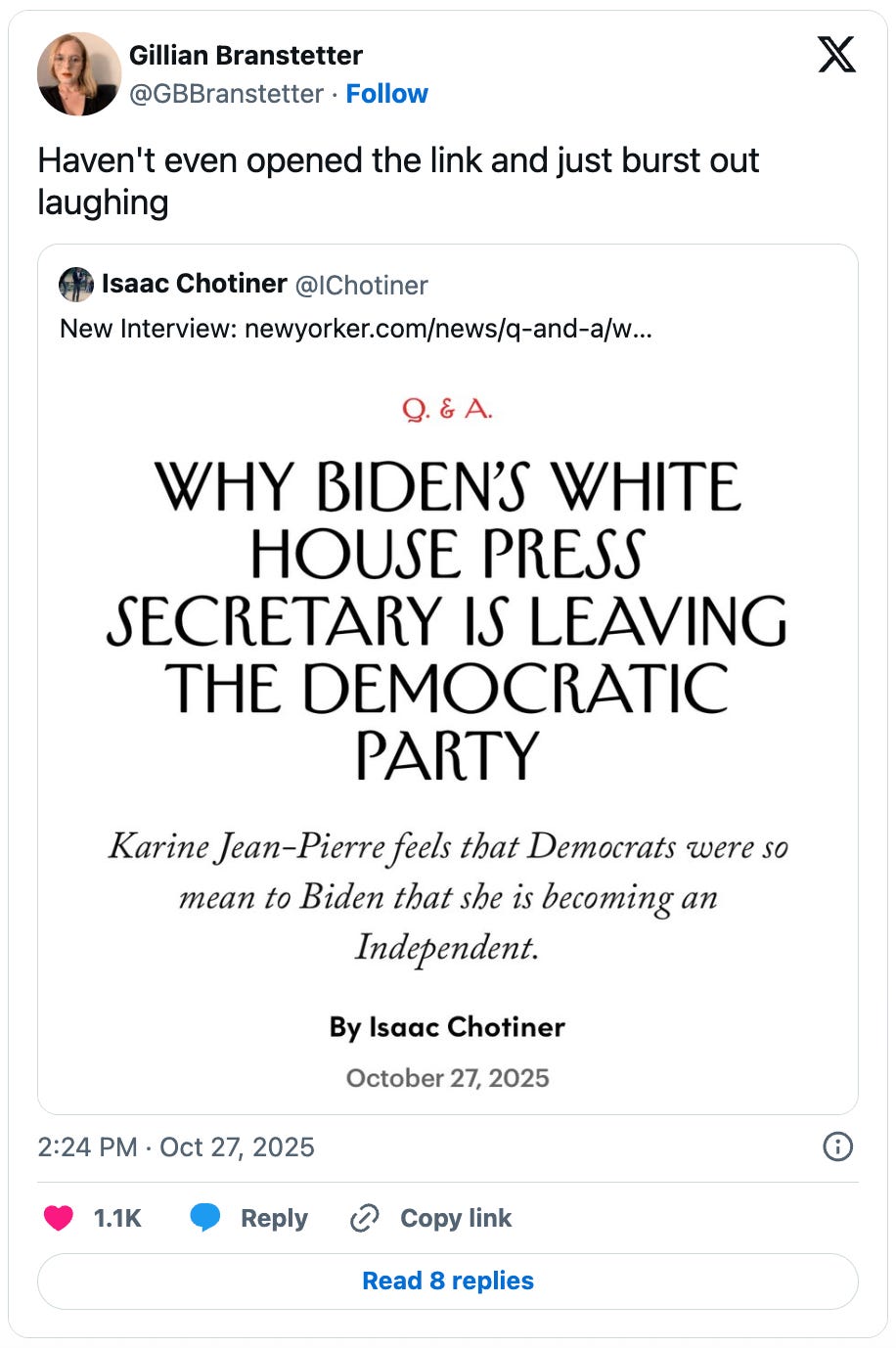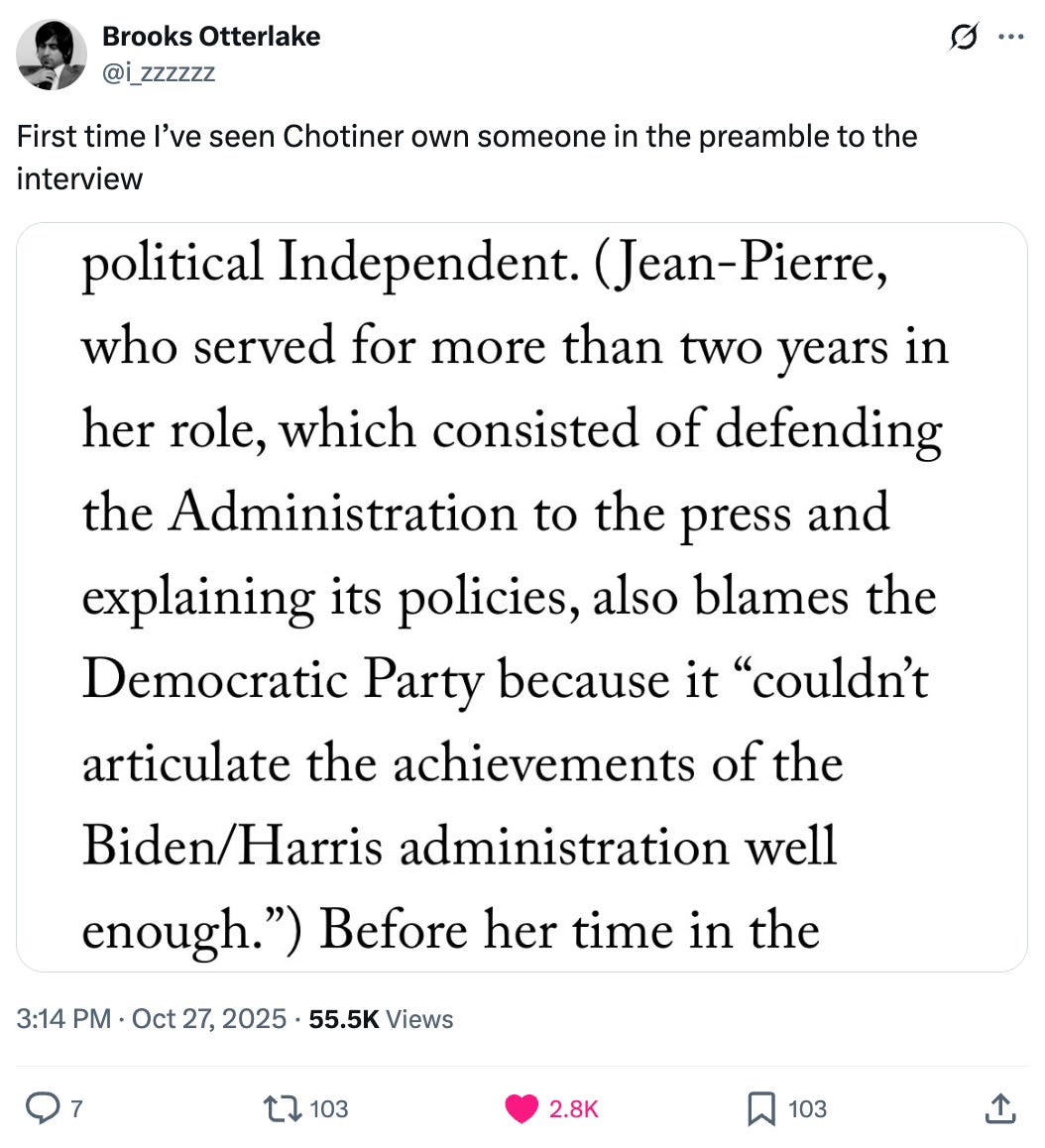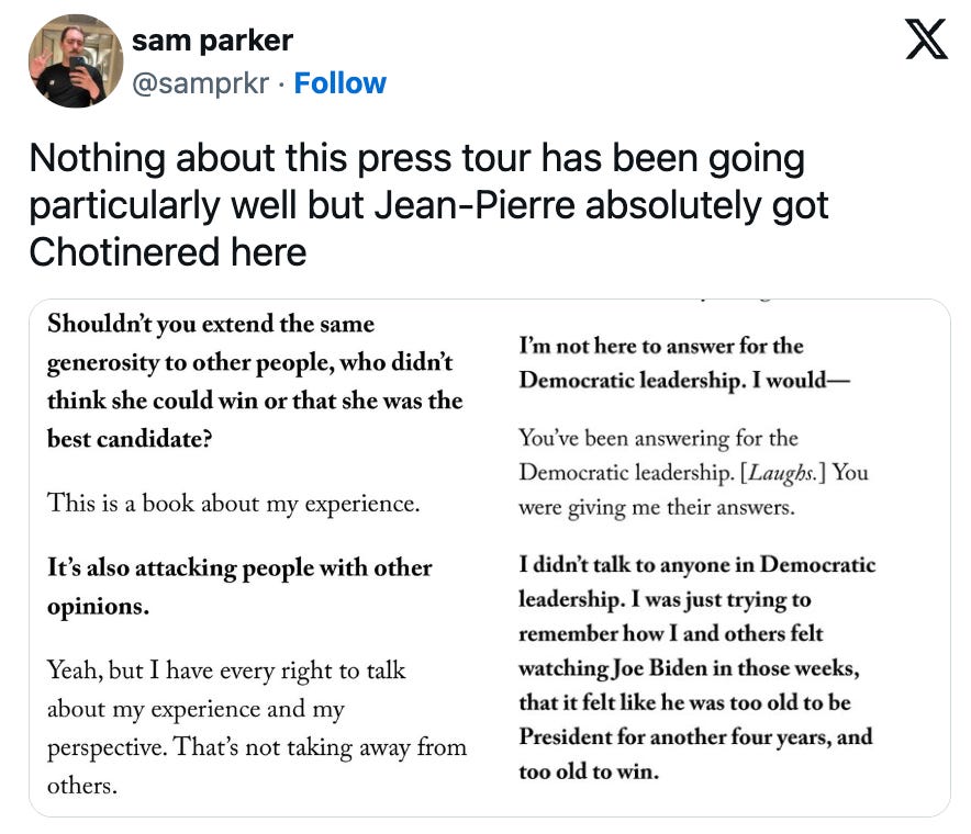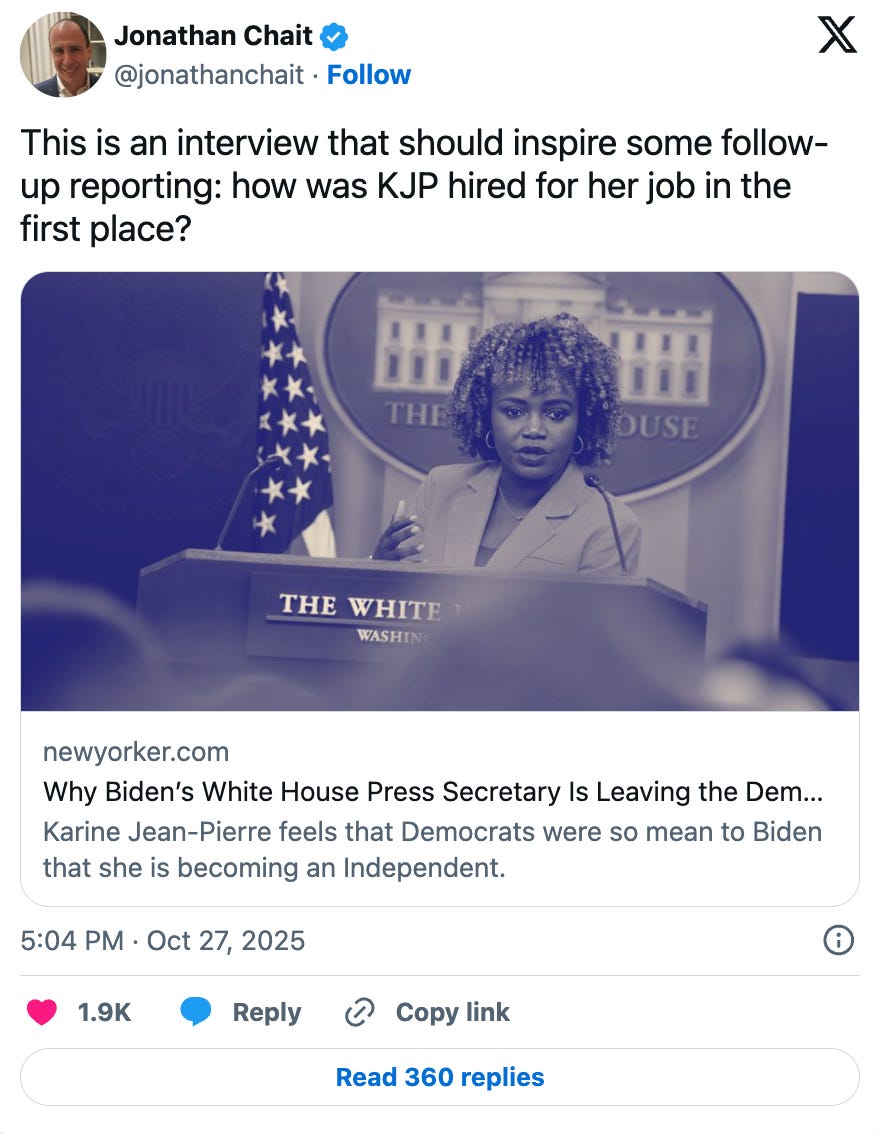 His latest victim subject is former Biden Press Secretary Karine Jean-Pierre, whose new book Independent: A Look Inside a Broken White House, Outside the Party Lines details her reasoning for leaving the Democratic Party on the grounds of the party’s disloyalty to President Biden. If that sentence made you feel like you were having a stroke just reading it, well: