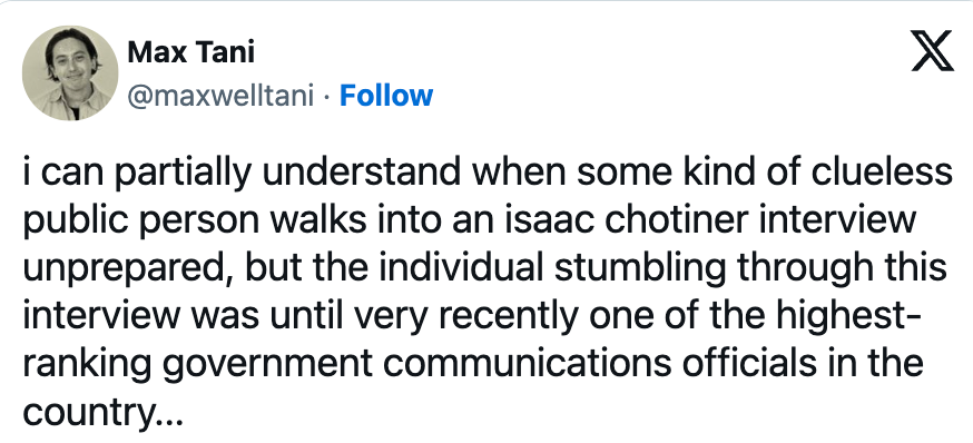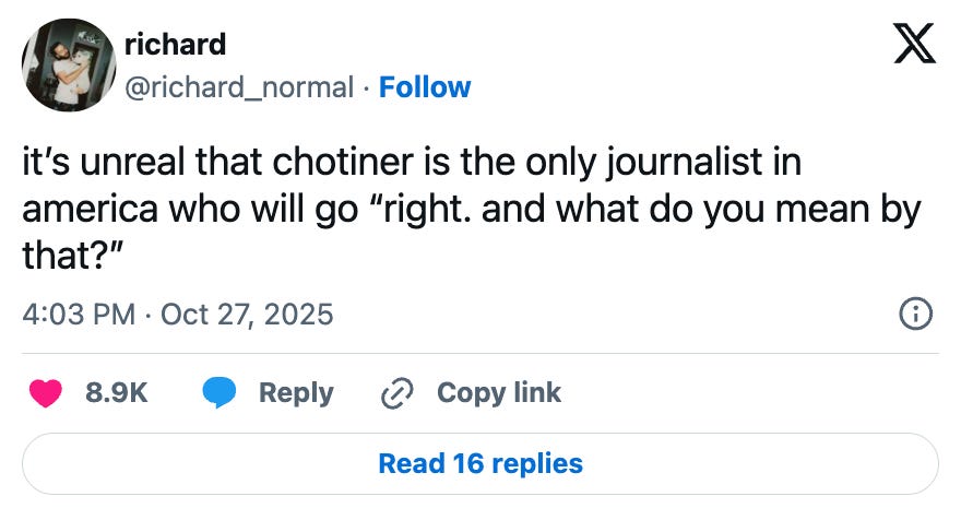 On Twitter, The New Yorker writer and interviewer Isaac Chotiner has become something of an enduring meme, now notorious for his interviews in which public figures (most recently, legal scholar Cass Sunstein) appear to step willfully into rhetorical traps and make utter fools of themselves. One doesn’t even need a TNY subscription to read these Chotiner interviews, as they go viral screenshot by screenshot.